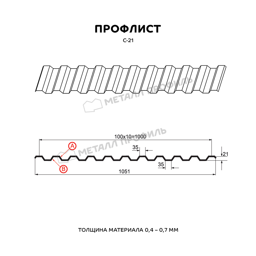 Профиль С-21 имеет толщину 0,7 мм, что обеспечивает прочность и долговечность конструкции.