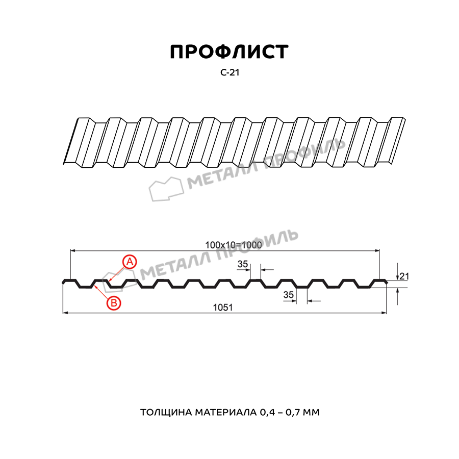 Профиль С-21 имеет толщину 0,5 мм, что обеспечивает прочность и долговечность конструкции.
