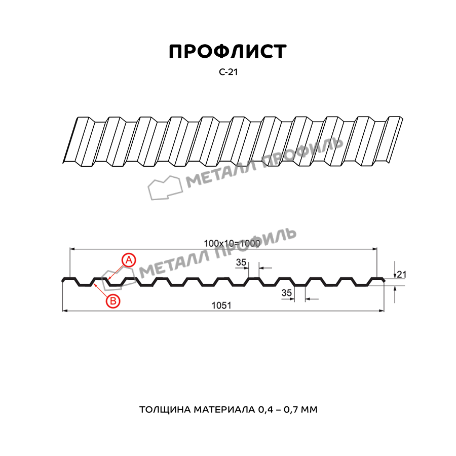 Профиль С-21 имеет толщину 0,5 мм, что обеспечивает прочность и долговечность конструкции.